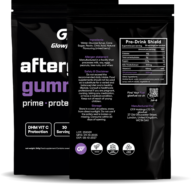 After Glow Gummies are formulated with a powerful blend of DHM (500mg), Milk Thistle (300mg), and Vitamin C (100mg) to support liver health, detox, and immunity.